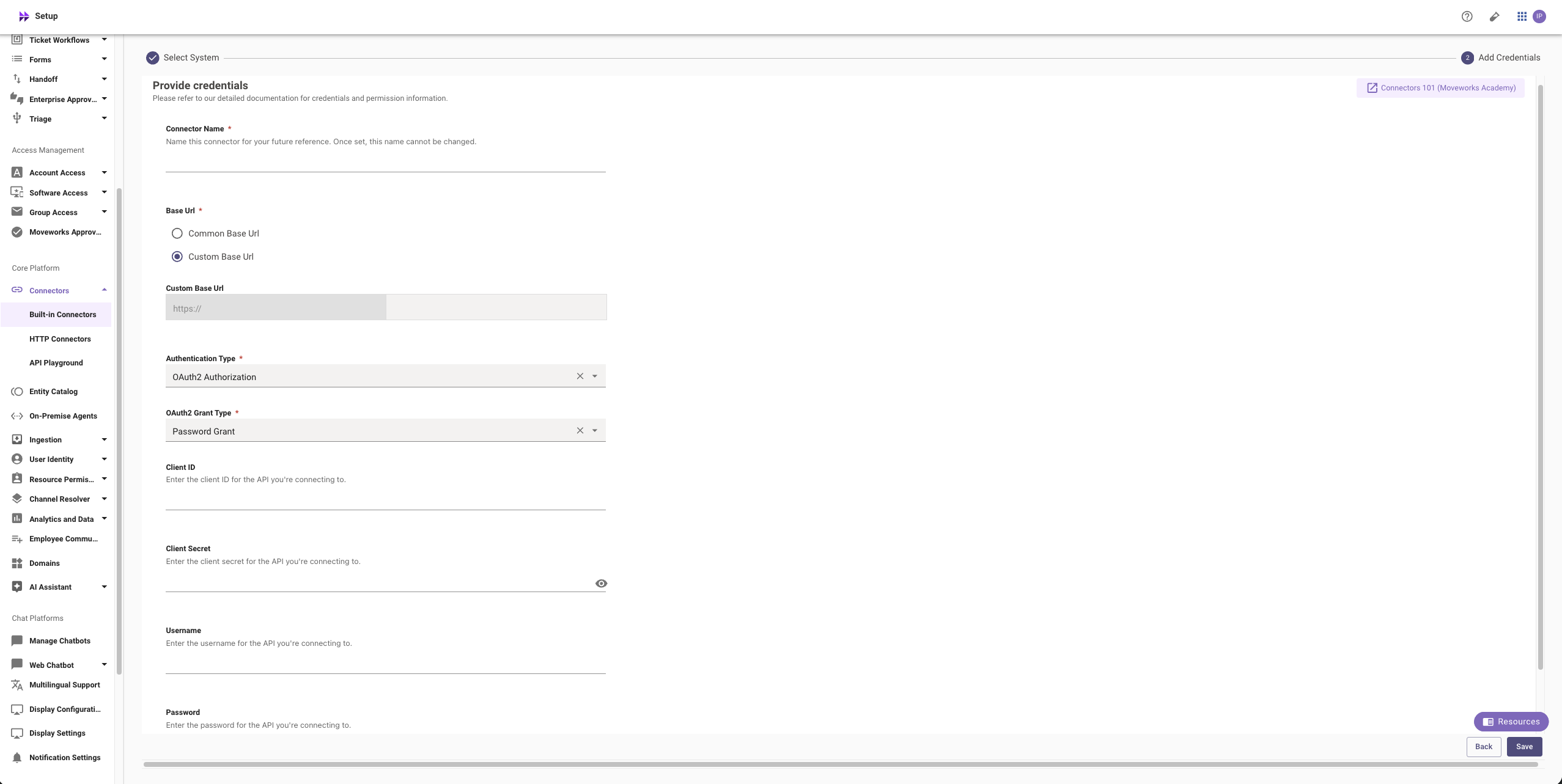 - Connector Selection: In this configuration block, you are required to select the required connector to enable Moveworks to connect and fetch data