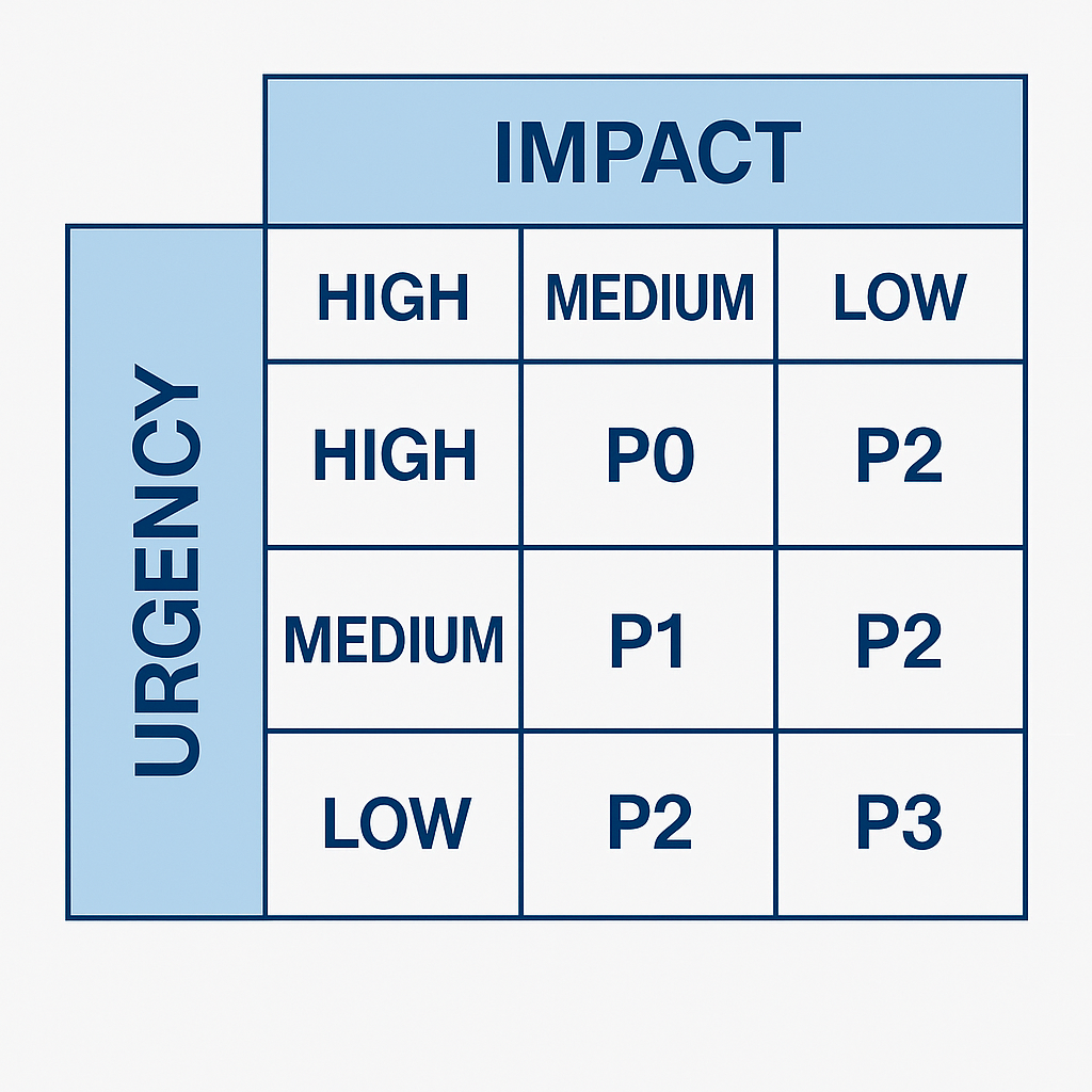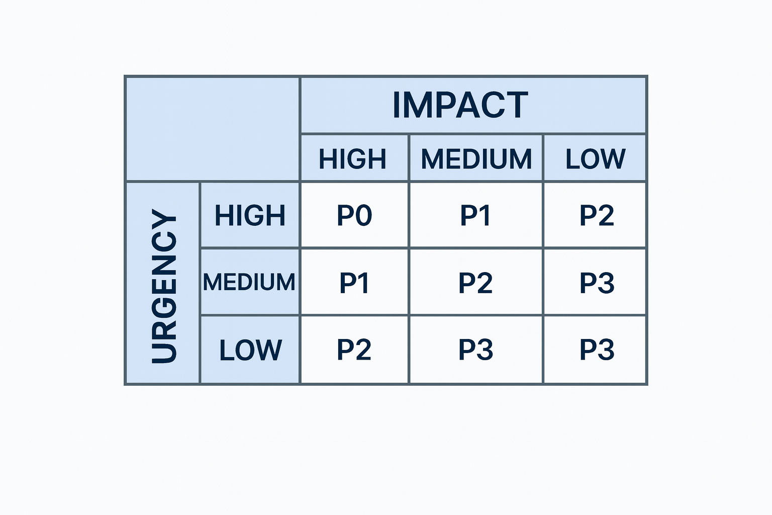 Support issues are handled according to a priority level determined by the selected Impact and Urgency. See the Incident Priority Matrix and example scenarios for each level below: