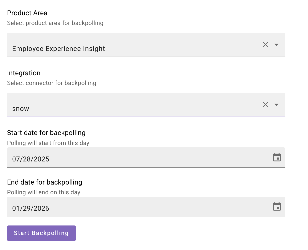 - Specify the start and end date for Ticket Backpolling. Note: It will include data from 00:00 UTC of the start date to 11:59:59 UTC of the end date