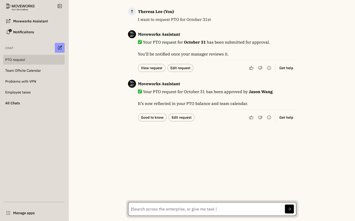 For example, if you submitted a request for paid time off, you’ll get a notification in the same thread once it’s approved.