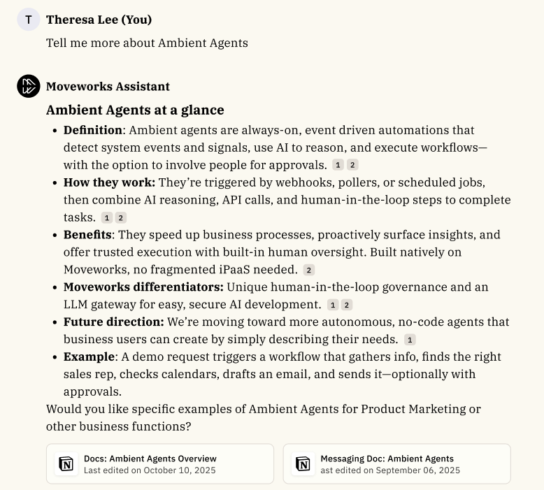 No. Citation cards are part of Moveworks’ transparency framework. They help users verify the Assistant’s responses and understand where information comes from.