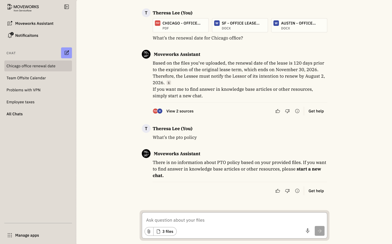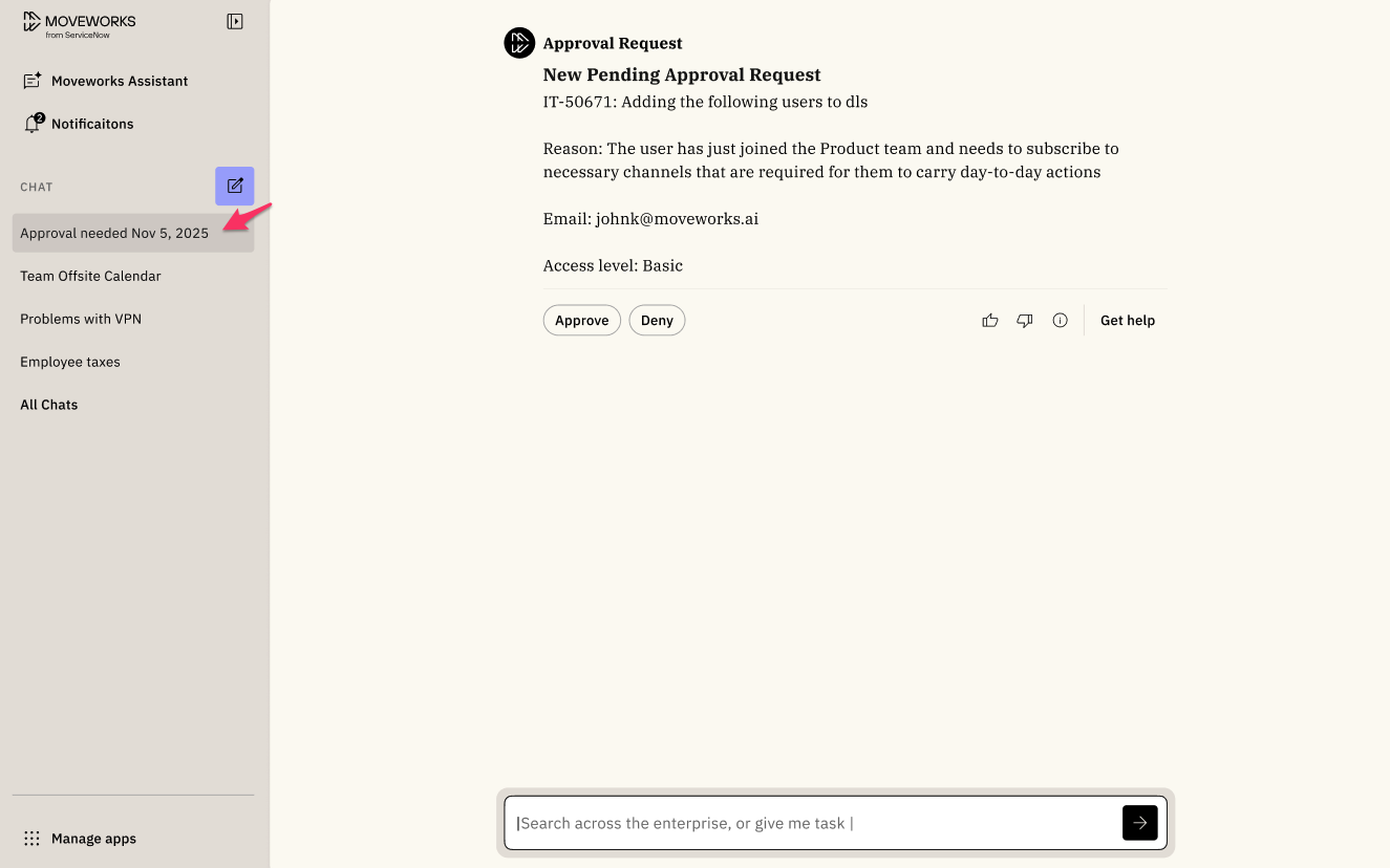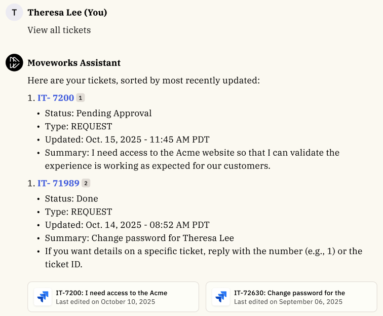 Assistant on Web brings everything the Moveworks Assistant can do into one web experience. Employees can ask questions, take action, and revisit past work. All plugins, automations, and enterprise capabilities included in your pricing and packaging are available here, along with new features built specifically for the web experience.
