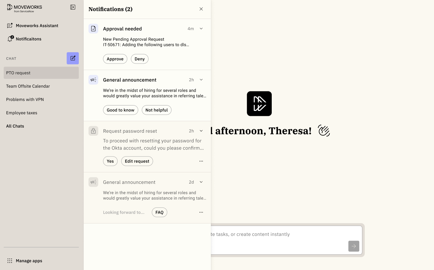 Different types of notifications appear in Assistant on Web each triggered by a different Moveworks plugin or automation. Each notification includes an icon, notification label, and preview of the notification so you can quickly understand where it came from and what it’s about.