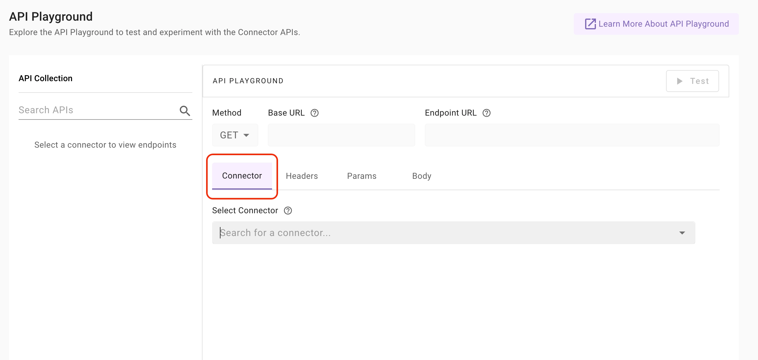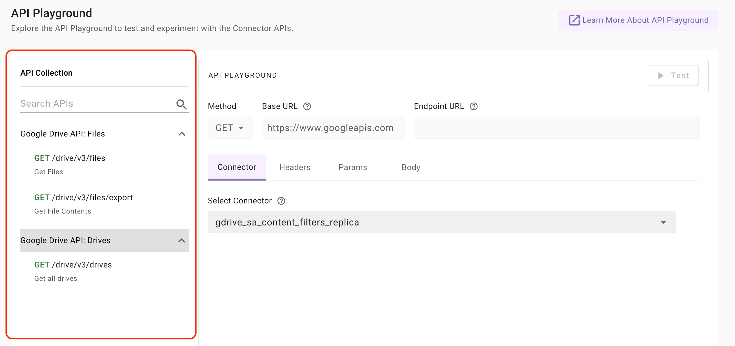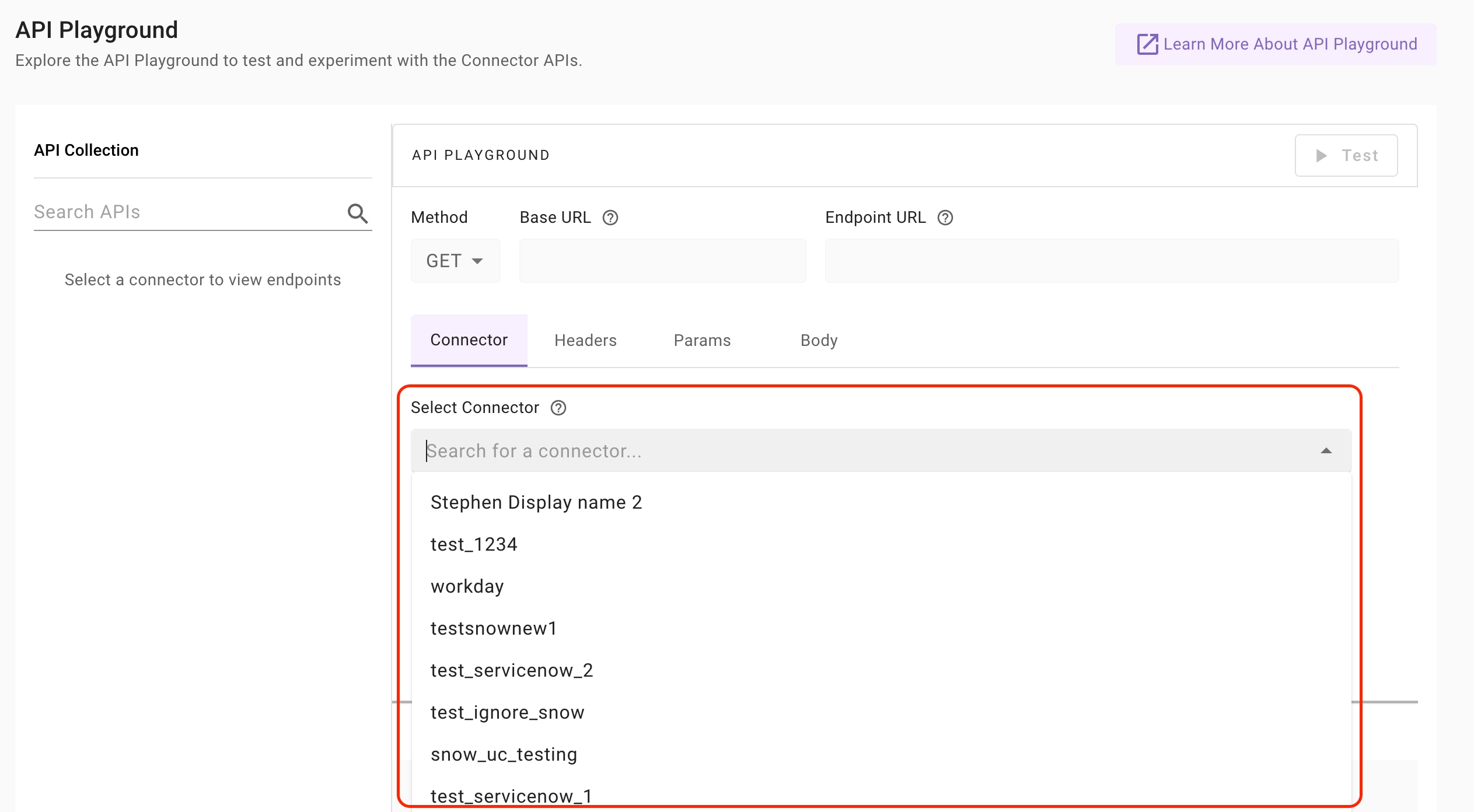 API Playground enables users to test API requests using built-in connectors, powered with a curated and vetted API Collection for each external system.