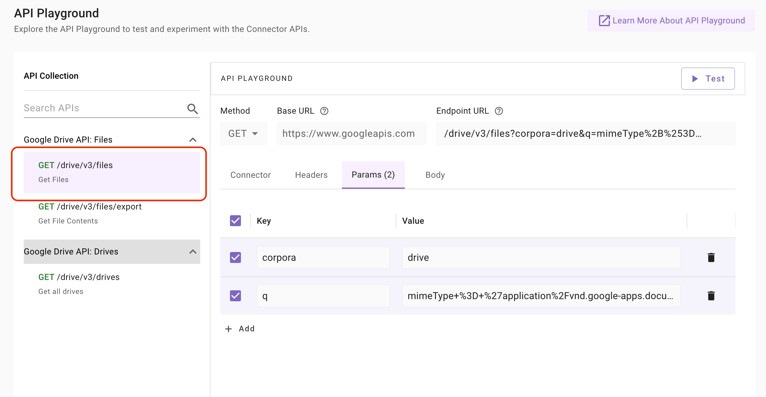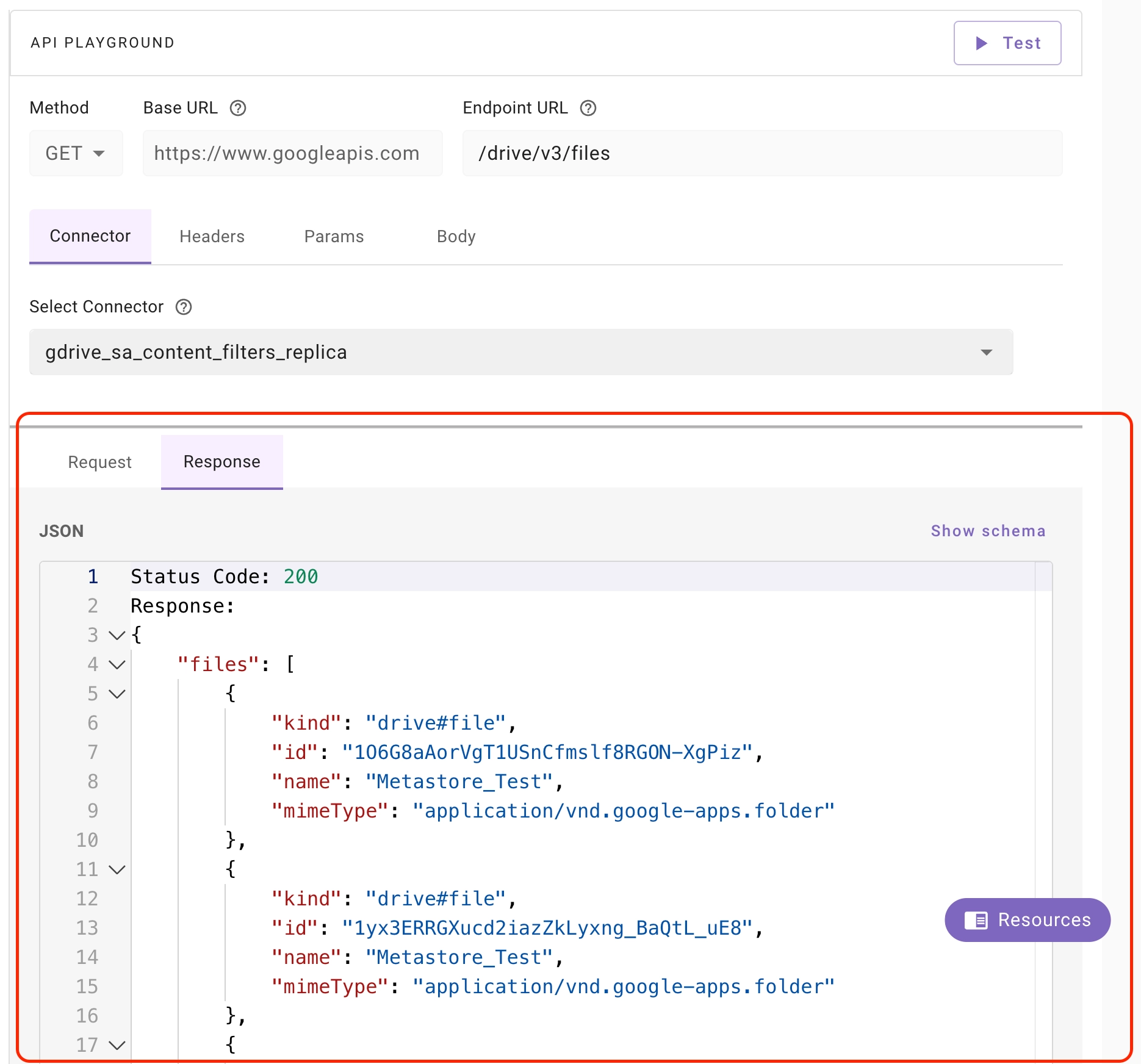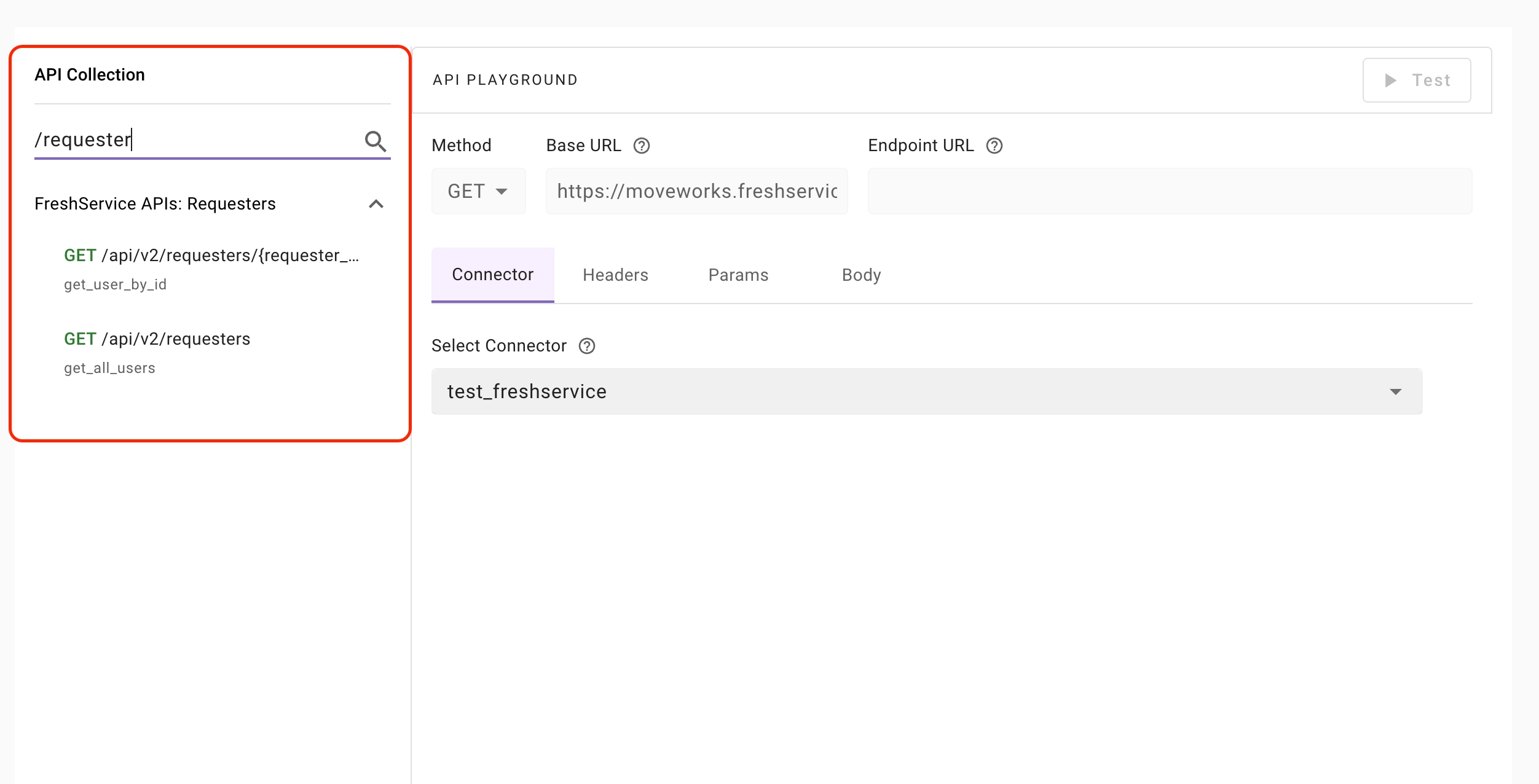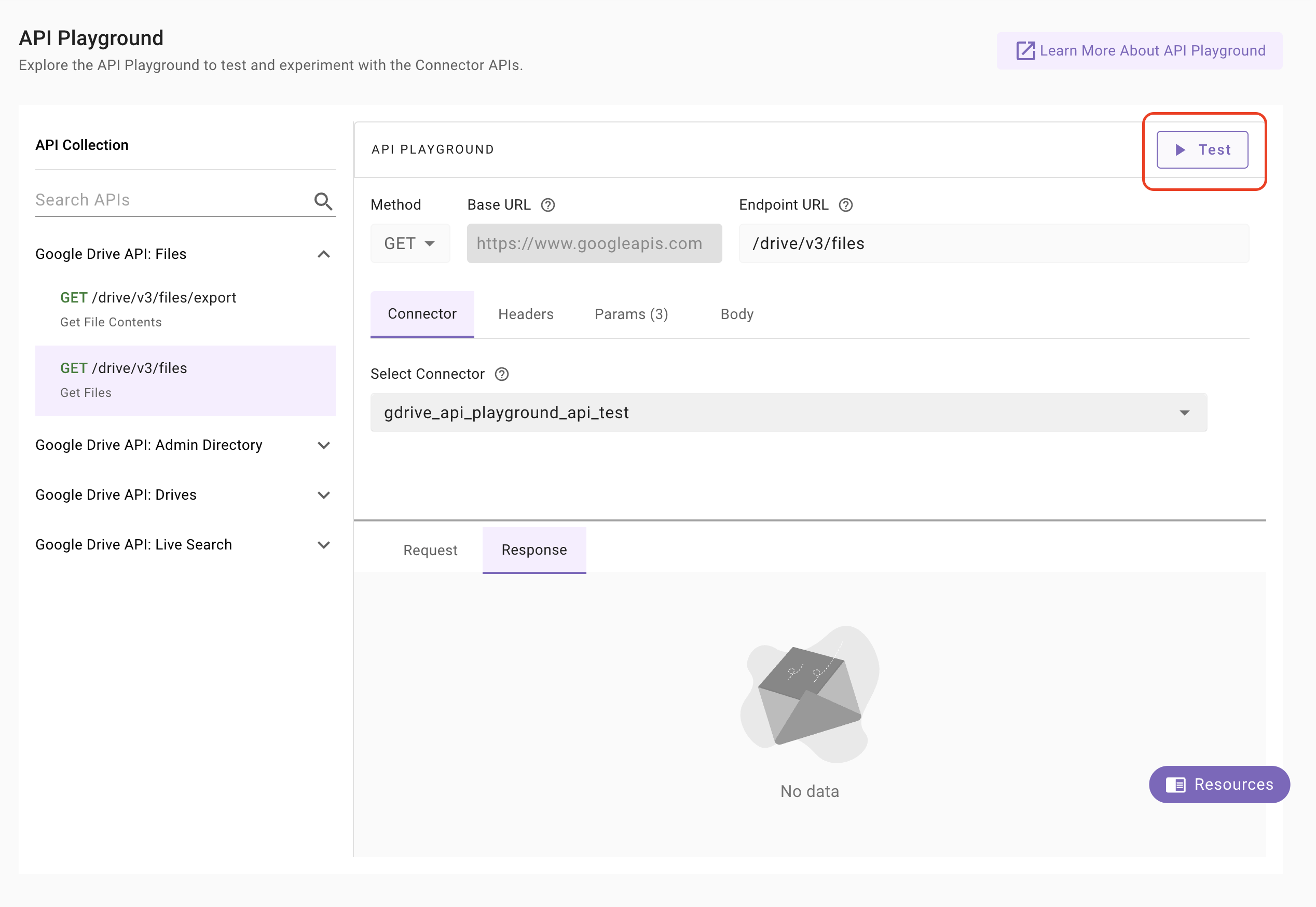 API Playground enables users to test API requests using built-in connectors, powered with a curated and vetted API Collection for each external system.