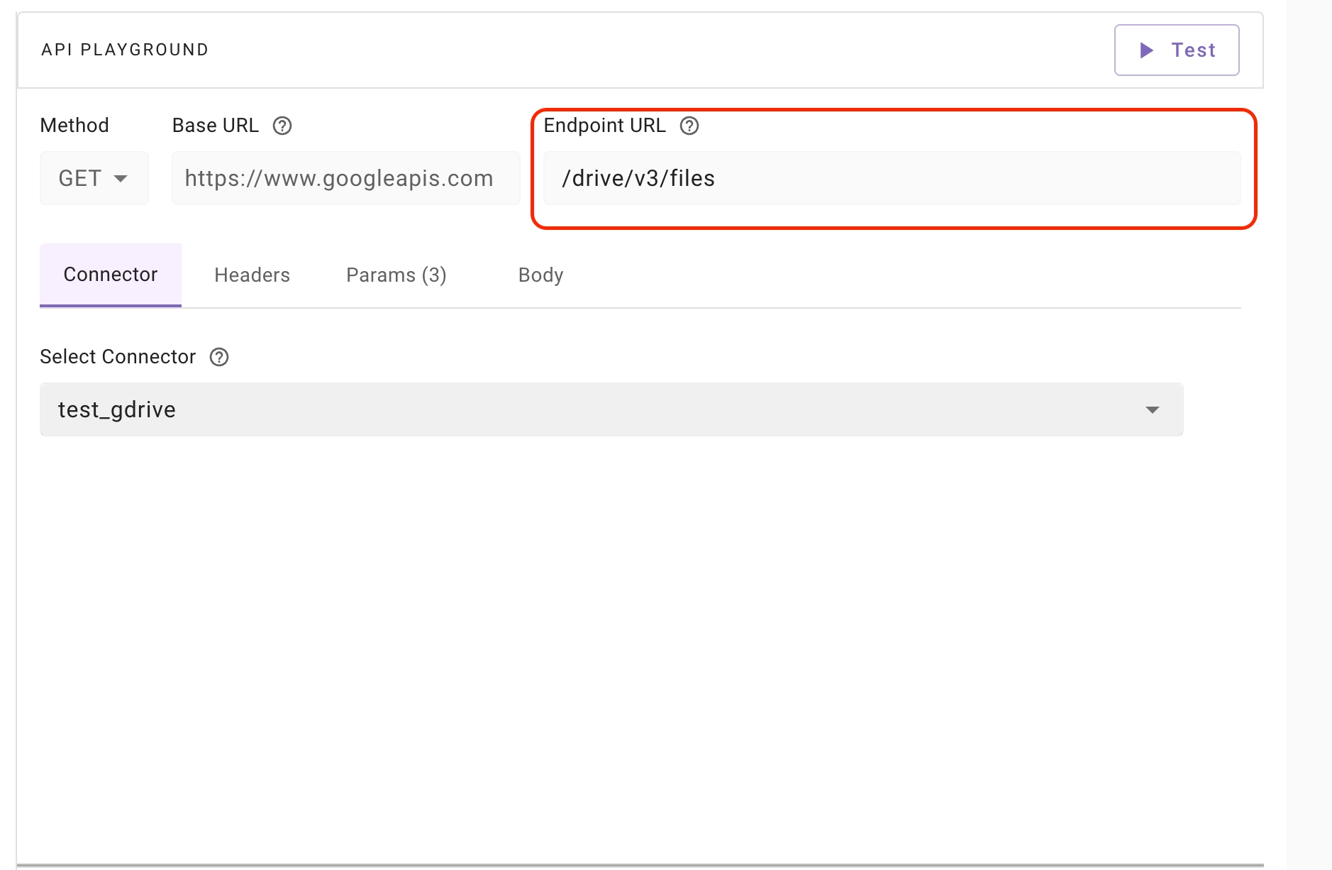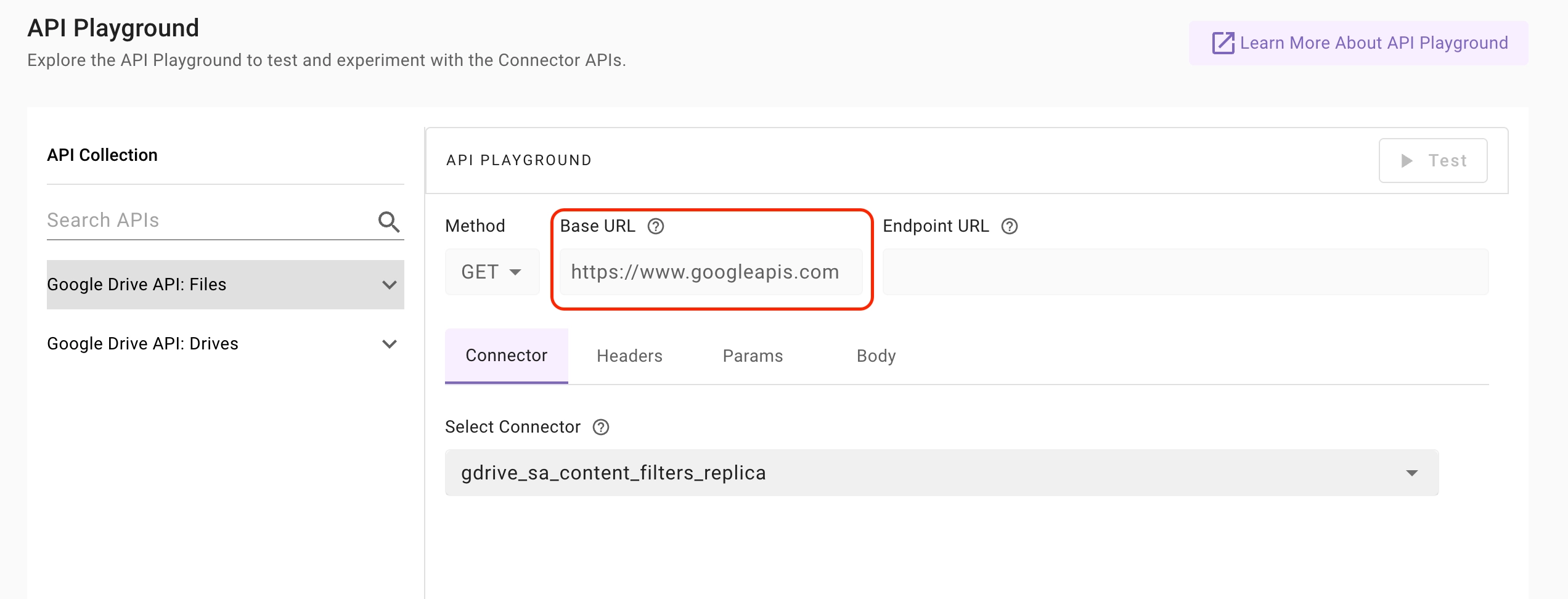 In API Playground, the Base URL field is not editable, as it is automatically resolved based on the selected API from the API Collection of the chosen connector.