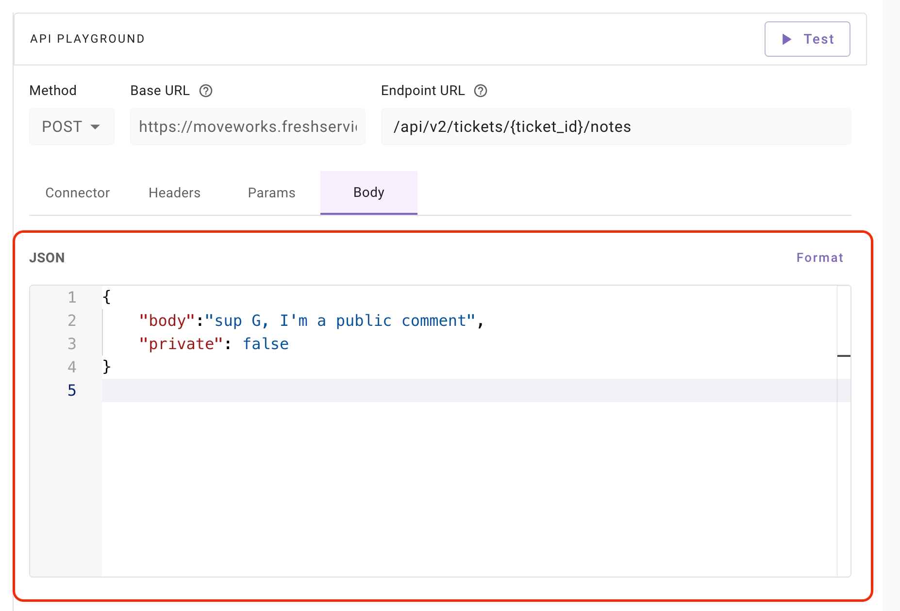 Test Button allows you to send API requests to external systems and view the responses, status codes, and any errors returned from the server.
